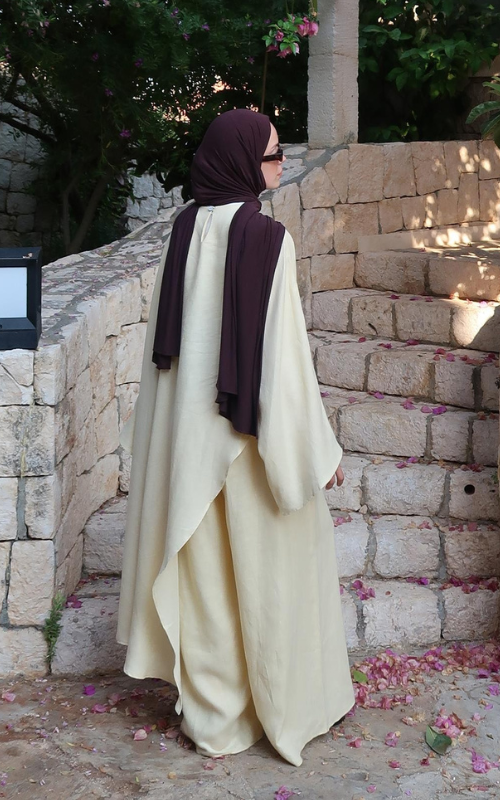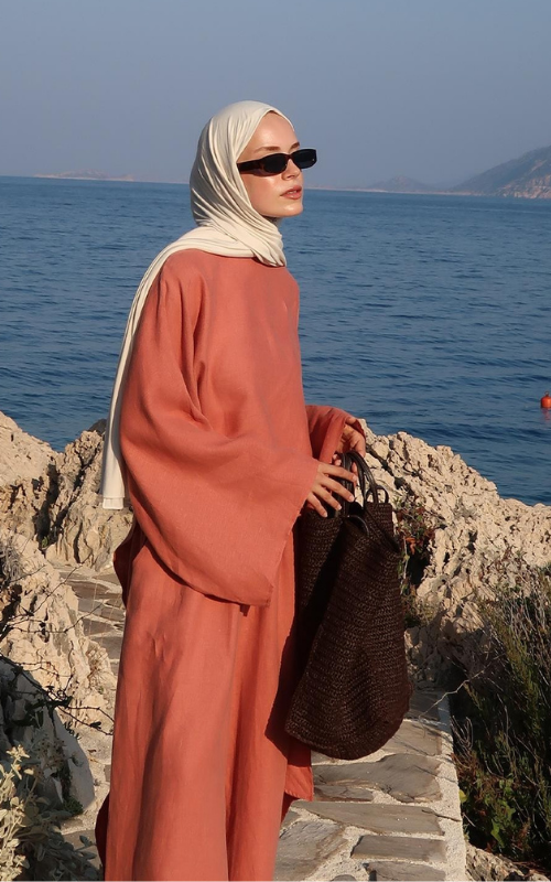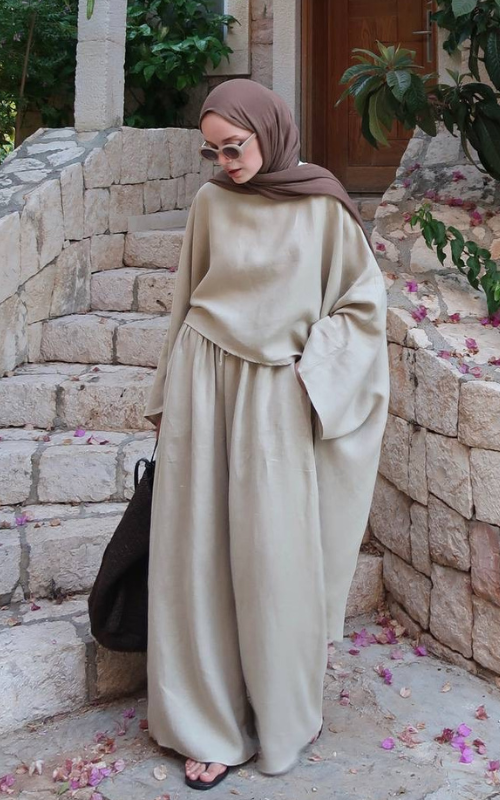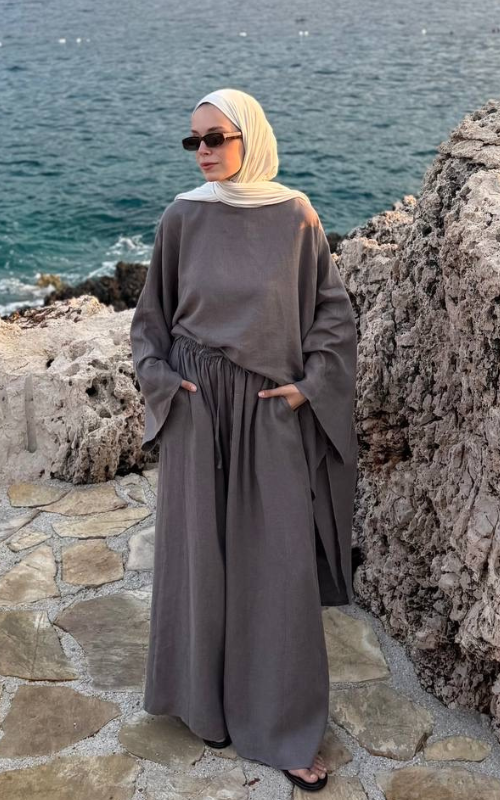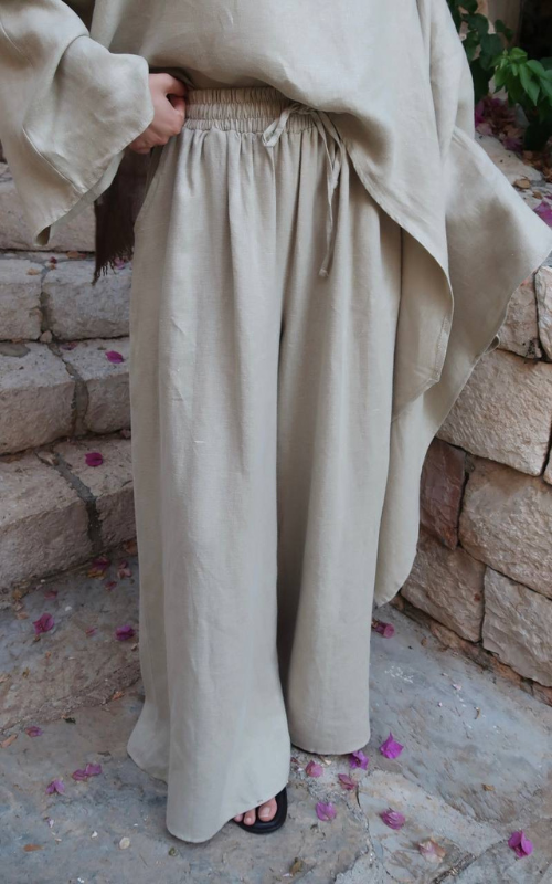 Our Oasis Set features a flowy set featuring a wide-sleeved, oversized top with an asymmetric hem, paired with high-waisted drawstring palazzo trousers.