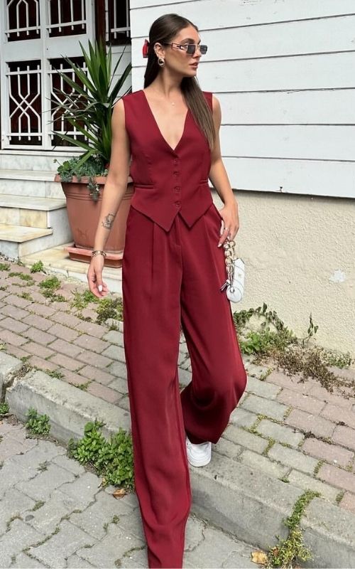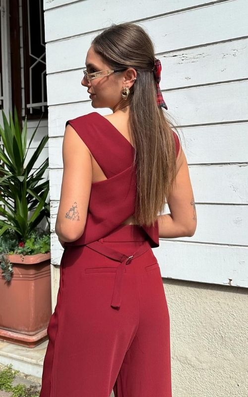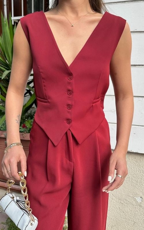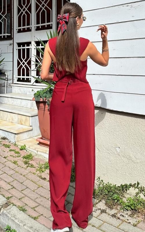 Stand out with out Scarlett Set, a combo of contemporary details and bold color. Featuring a stylish vest with a unique cross-back design and crafted bottoms with cute back pocket design.