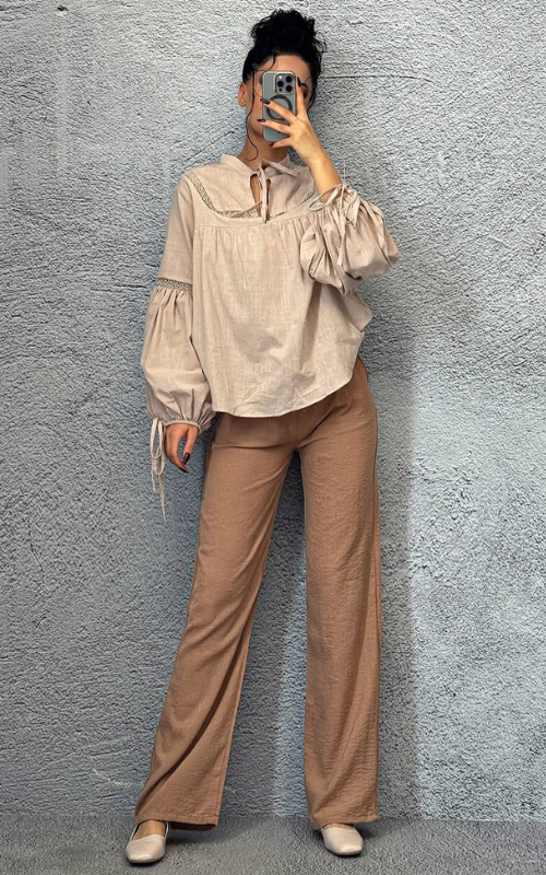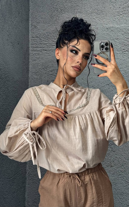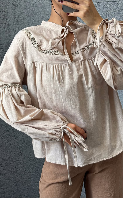 The Vintage Top features delicate crochet lace trim across the chest and sleeves. Designed with a tie-front neckline and voluminous balloon sleeves finished with gathered cuffs and ribbon ties.