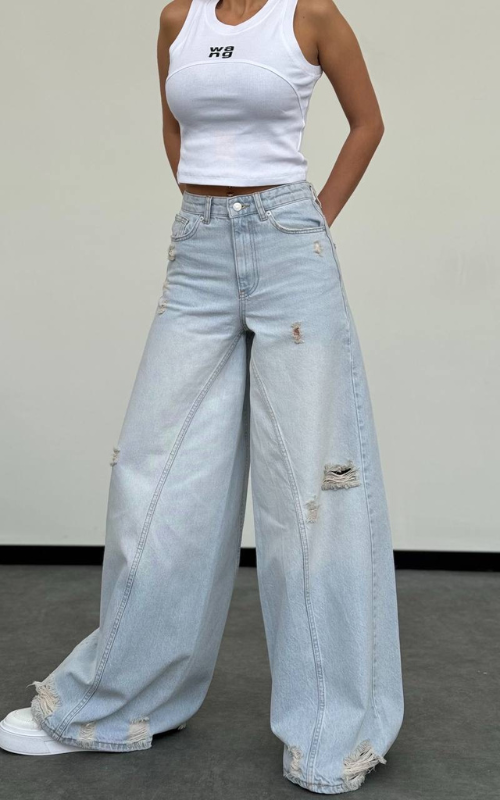 Our City Pants feature a light blue wash effect and a high-waist fit. With edgy line details across the front, a flare cut, and a distressed effect, they bring the perfect street-style edge to any look.