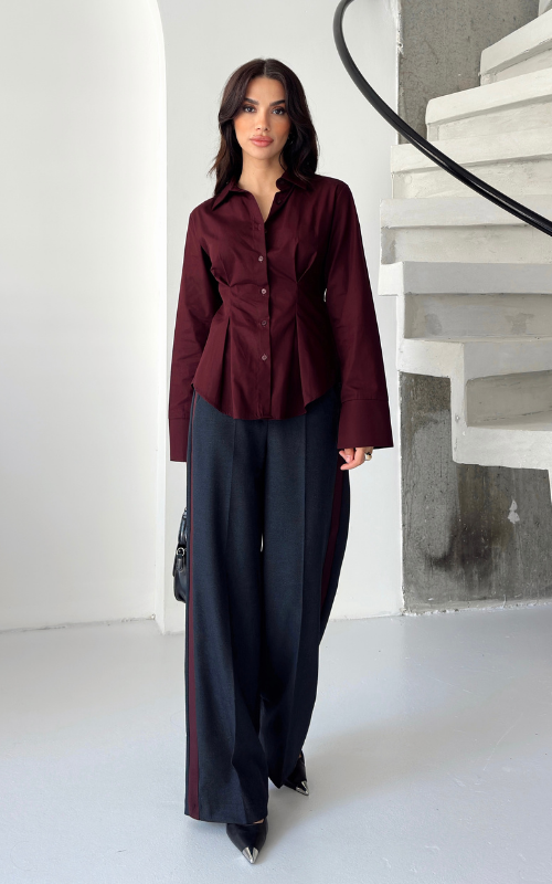Wide leg, high waisted pant with front pockets. Decorated with a contrasting side strip in different color for a modern touch.