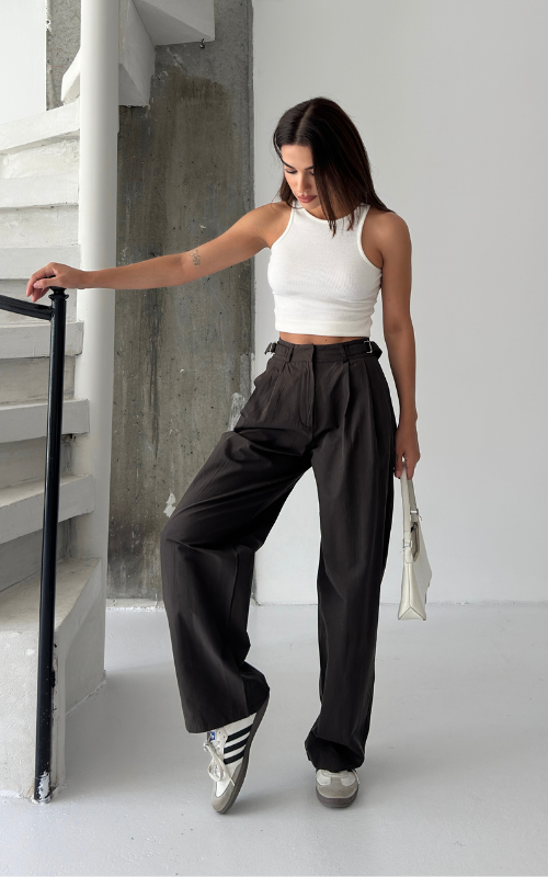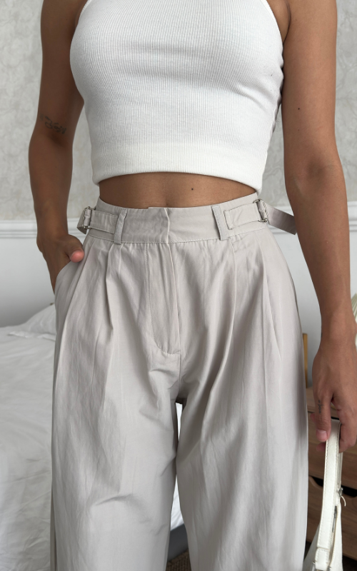 The French Pants features a high-rise waist with front pleats. Designed with a relaxed, tapered leg, side pockets and a matching self-fabric belt strap with loops.