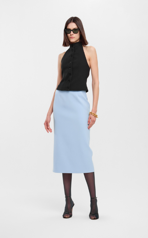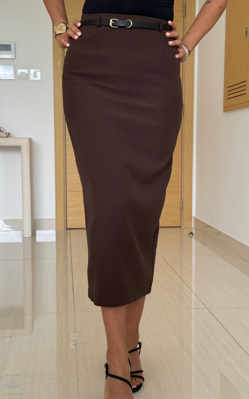 The Ivana Skirt is a pencil midi skirt crafted from luxe fabric, paired with a slim leather belt—perfect for achieving both casual elegance and a polished look.