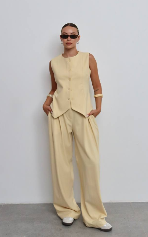 Wide-leg, high waisted pants with subtle front pleats for an airy look. Closed with a fly zipper and button for extra support.