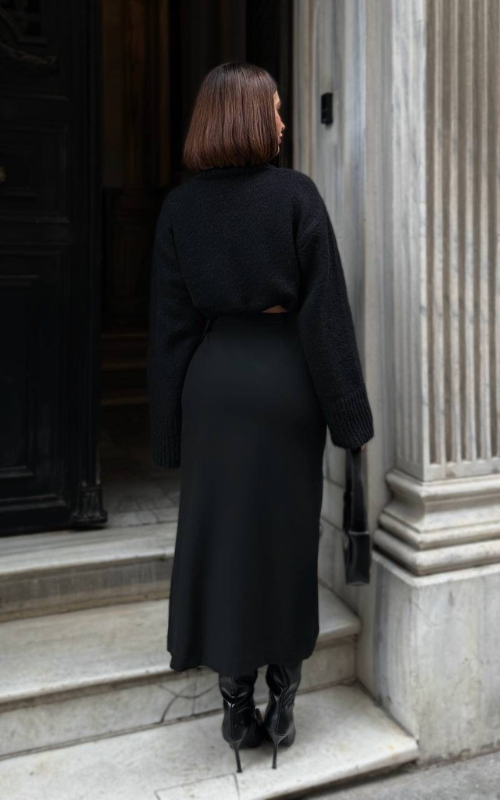 High-waisted black midi skirt featuring a front slit with sheer fabric and tailored waistband. A versatile and modern piece for elevated day-to-night looks.