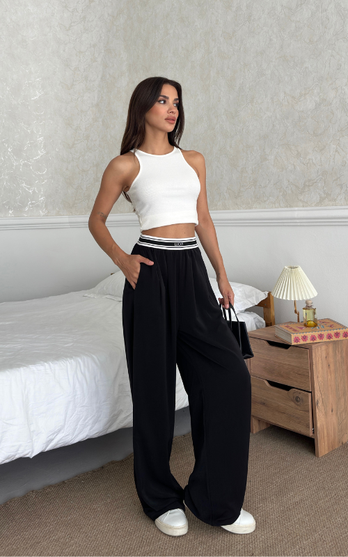 Our Lucky Pants is a wide-leg pants featuring a soft, flowy fabric. The elastic waistband has a sporty double-stripe detailing thats adds a casual-chic touch.