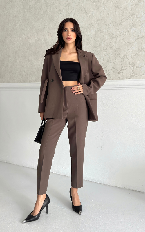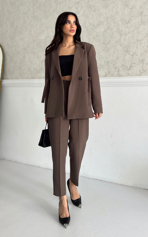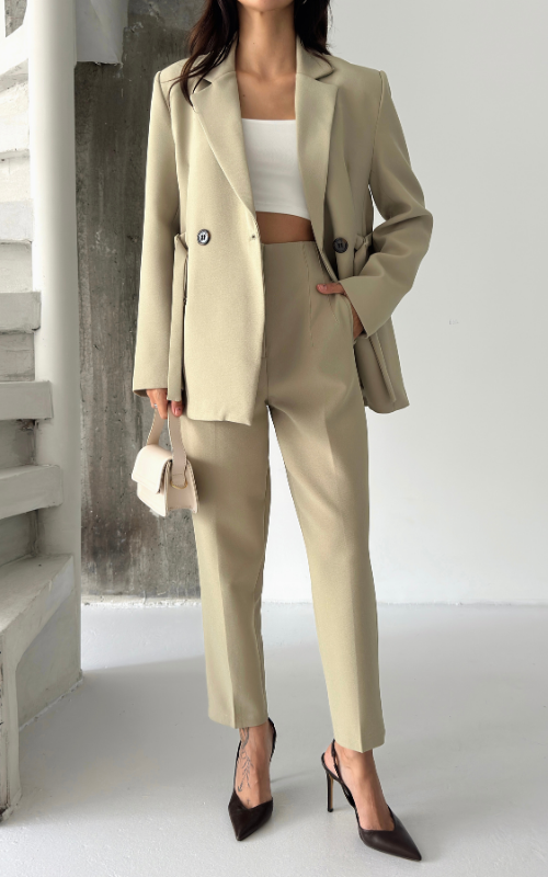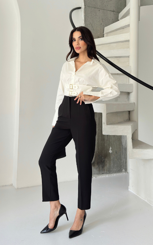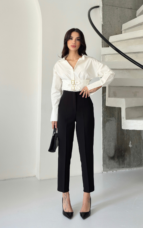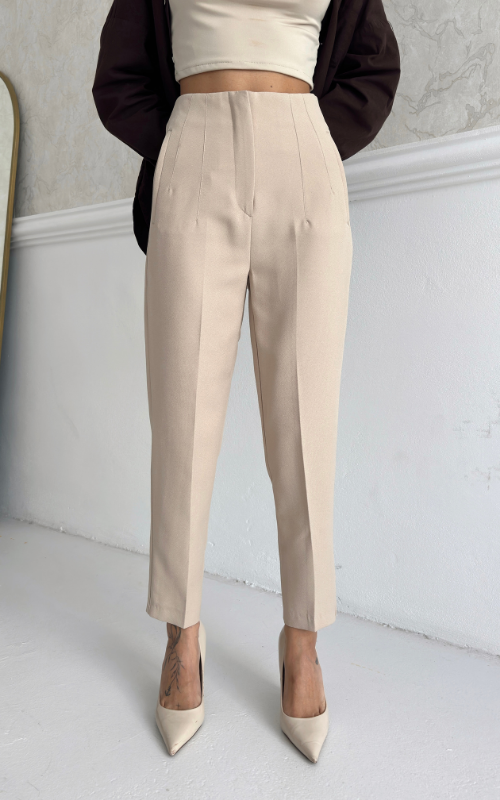 High waisted pant tailored to perfection. Waistband includes subtle ‘V’ design detail. Pin-tuck along the front for a refined look and slightly cuffed ankles.