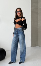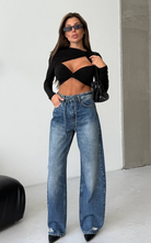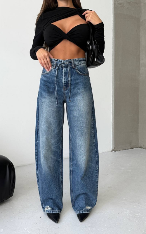 Slight barrel cut denim pant with button closure and added tie belt on the waistline.
