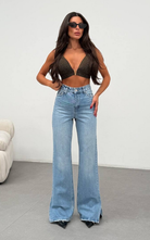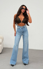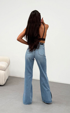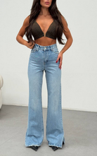 Pant crafted from denim featuring a high waisted cut, flared hemline adorned with an open side slit for added flare.