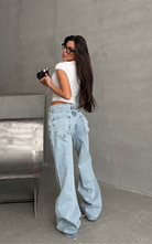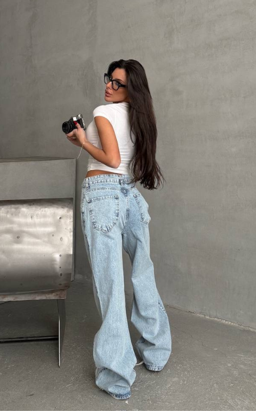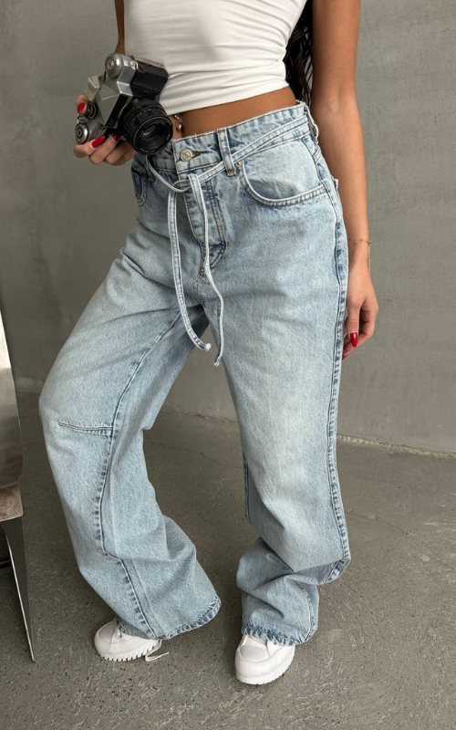 High waisted, straight cut denim pant with button closure and added tie belt.