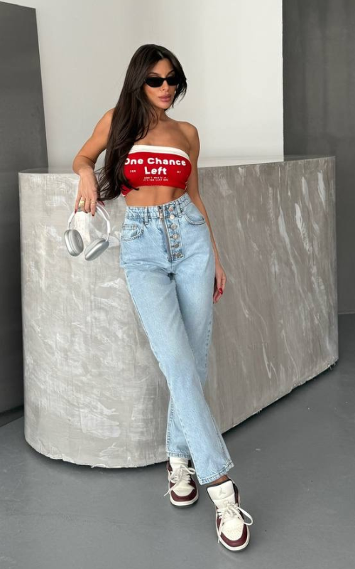 Our Solace Pants feature a light blue wash, a high-waist fit, stylish metal buttons closure with zipper, and a tapered cut, offering a trendy and chic vibe.