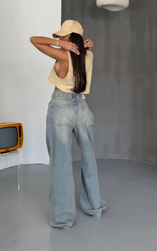 The Zone Pants is a wide-leg jeans in a vintage light wash, featuring distressed knees, paint-splatter details, and a sporty exposed elastic waistband for a streetwear twist.