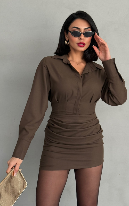 The Charming Dress features a long-sleeve top with a sleek collar and pleat detail on the chest, featuring ruched detailing at the waist for a chic and modern look.