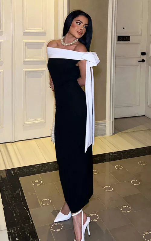 Dress to impress in our BowBliss, a contrast trim off-shoulder bodycon dress with a statement bow.