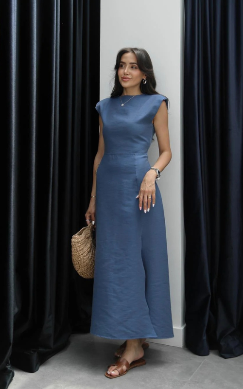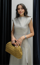 The Chloe Dress is a midi dress featuring padded shoulders, a high round neckline, and a flattering fitted waist. Designed with a side slit for added movement and elegance.