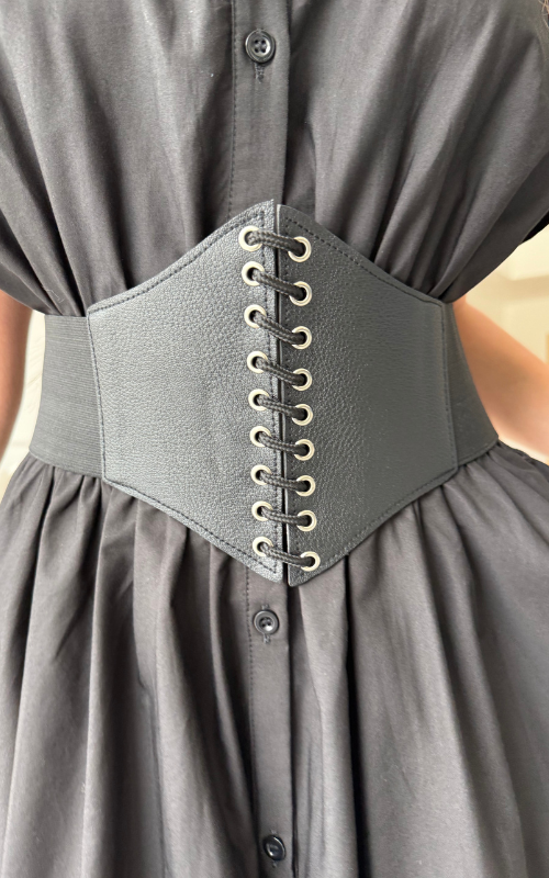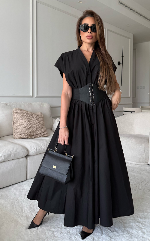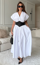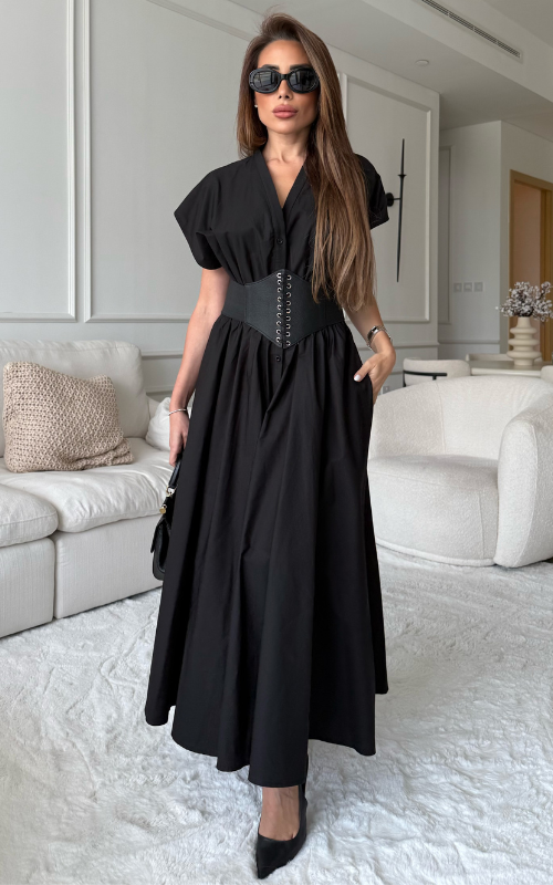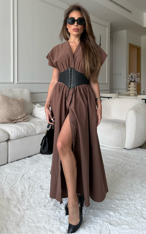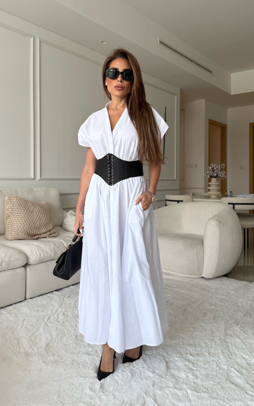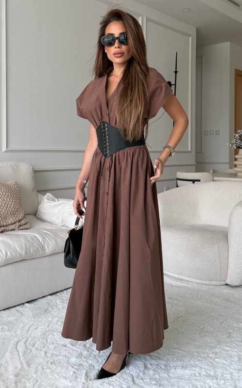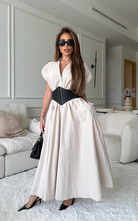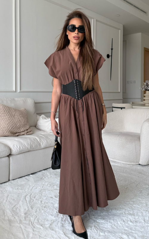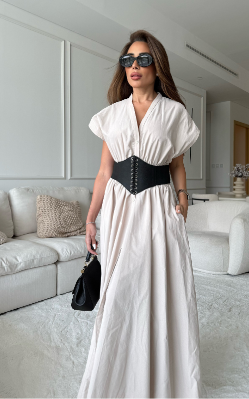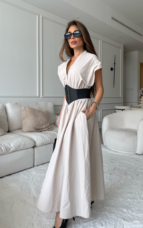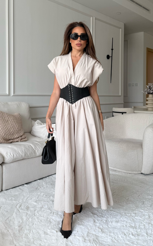 The Clay Dress is a flowy pleated midi dress with front button closure, structured cap sleeves and a soft V-neckline, styled with a wide corset belt for a flattering, cinched waist.