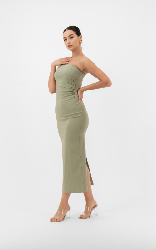 A sleek body-hugging midi dress, designed with elegant rouched bodice. Featuring a back slit for ease of movement and a concealed zipper closure, it balances sophistication with a modern, flattering silhouette.