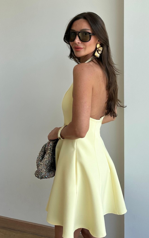 The Linda Dress features a halter round-neck, sleeveless design with a graceful, flowy silhouette—perfect for an effortlessly elegant and feminine look.