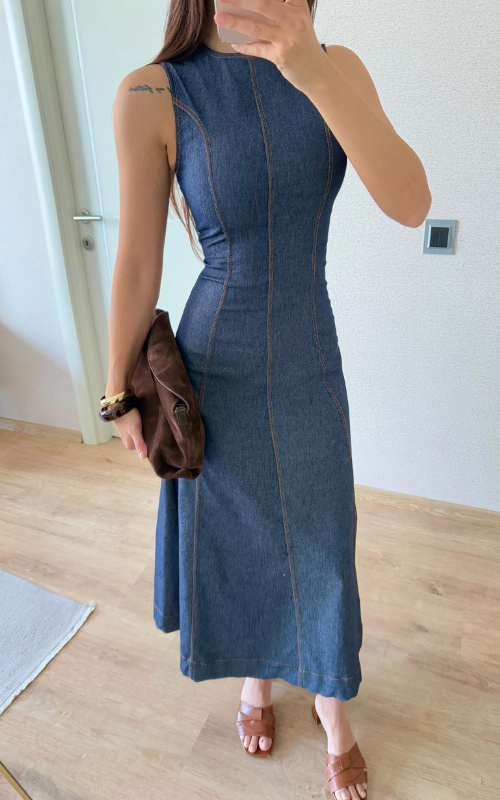 The Loud Dress is a maxi denim piece with a high round collar, sleeveless cut, and front seam detailing that defines your figure back zipper closure.