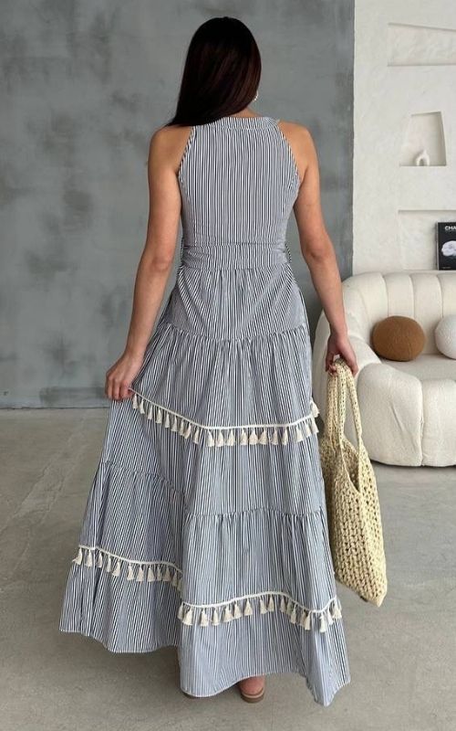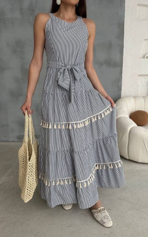 Stand out from the crowd in our Maria Dress, a long tiered dress with tassels that provide a playful and bohemian touch, while belt adds a stylish accent and enhances the figure.