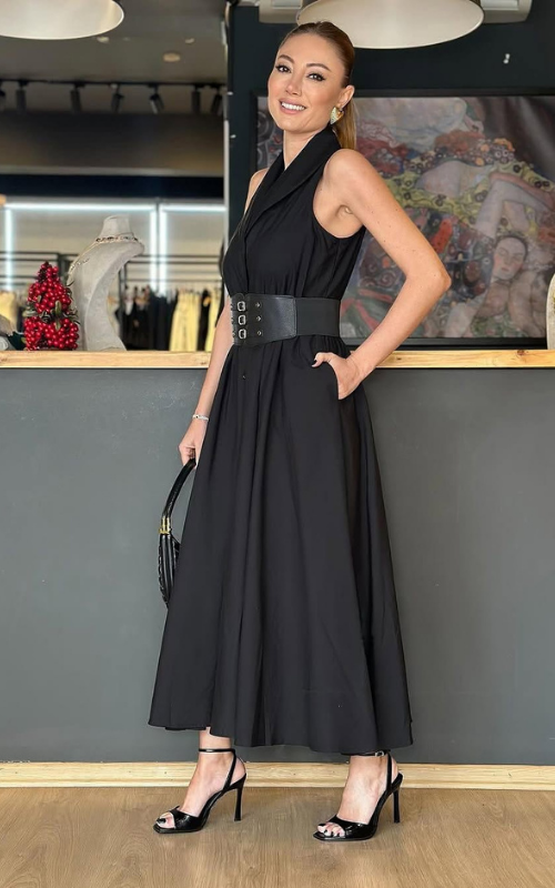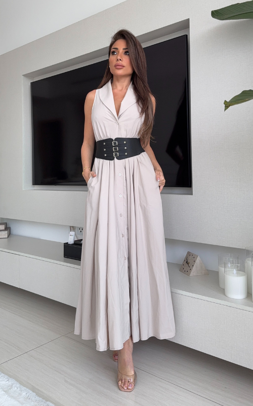 The Mindy Dress is a sleeveless maxi dress featuring bold collar detailing, front button closures, and a corset-style belt that flatters the waist for a structured yet elegant look.