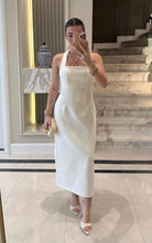 The Vida Dress is a feminine midi-length piece with a sleek halter neck and square neckline, blending elegance and charm for a stylish look.