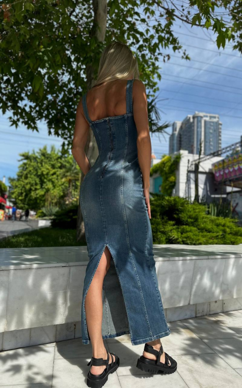 Introducing Enchanting Denim Dress, a denim dress designed to unleash your inner style goddess. This alluring dress showcases an exquisite split in the back, adding a touch of intrigue to every stride.