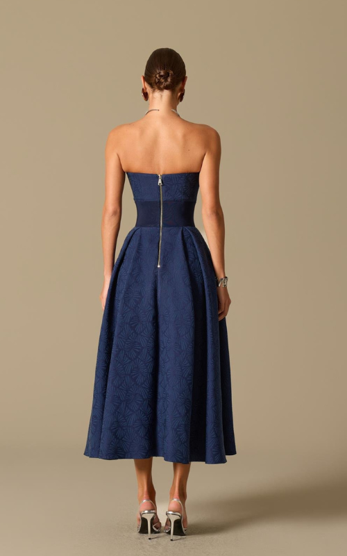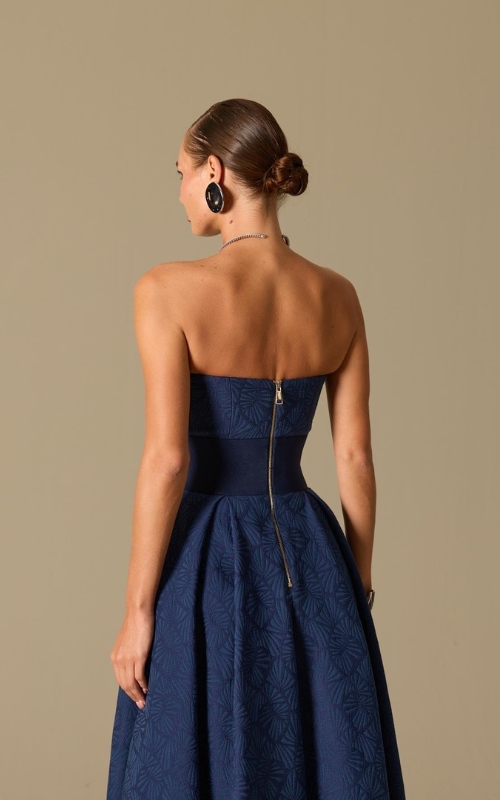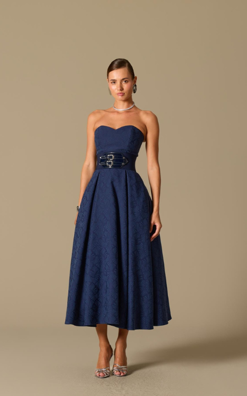Strapless dress with a textured jacquard pattern. Features a structured bodice, defined waist with a belt detail, and a softly pleated full skirt. Finished with side pockets and a concealed back zipper.
