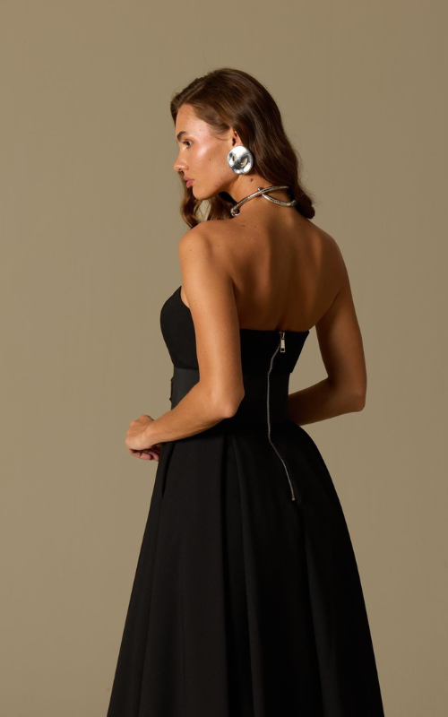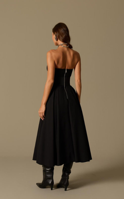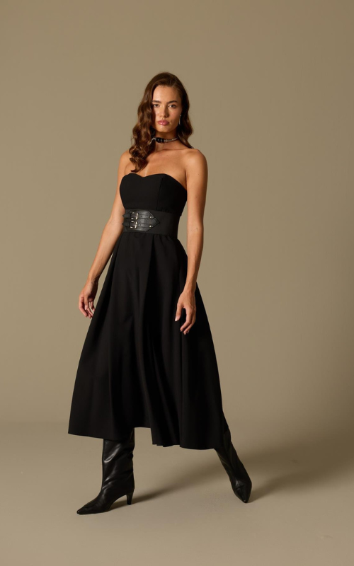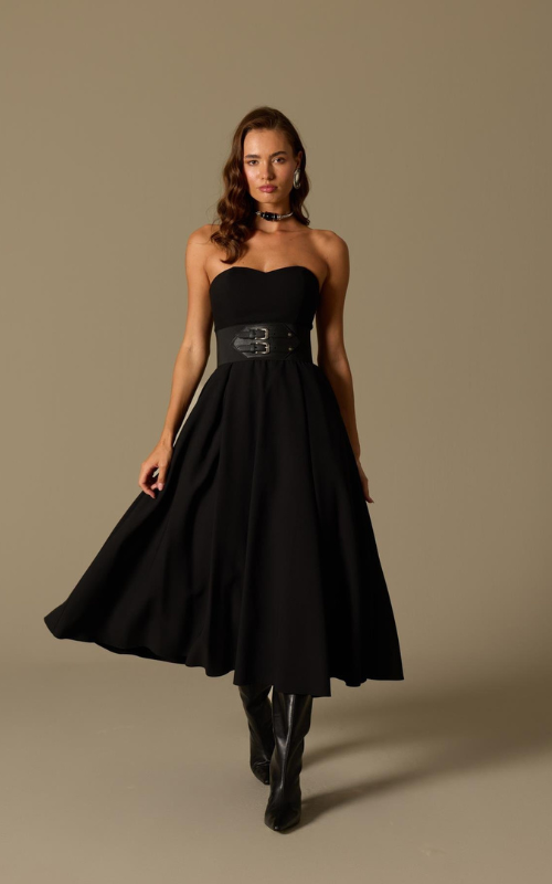 Strapless dress with a structured bodice and softly contoured neckline. Designed with a defined waist accented by a belt detail and a flowing, full skirt. Finished with a concealed back zipper and crafted from premium fabric.