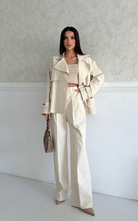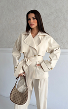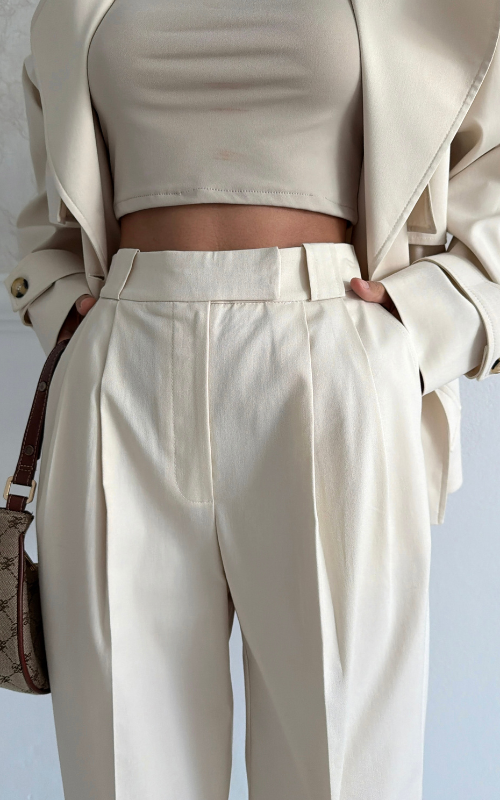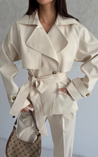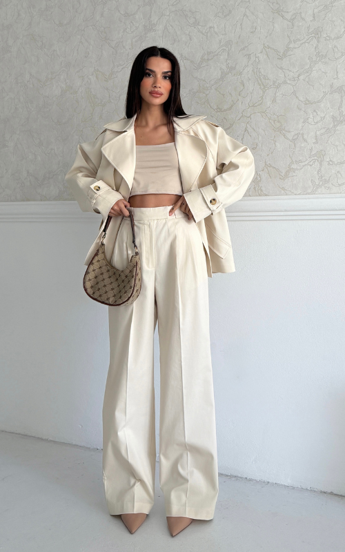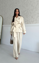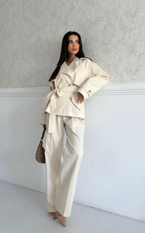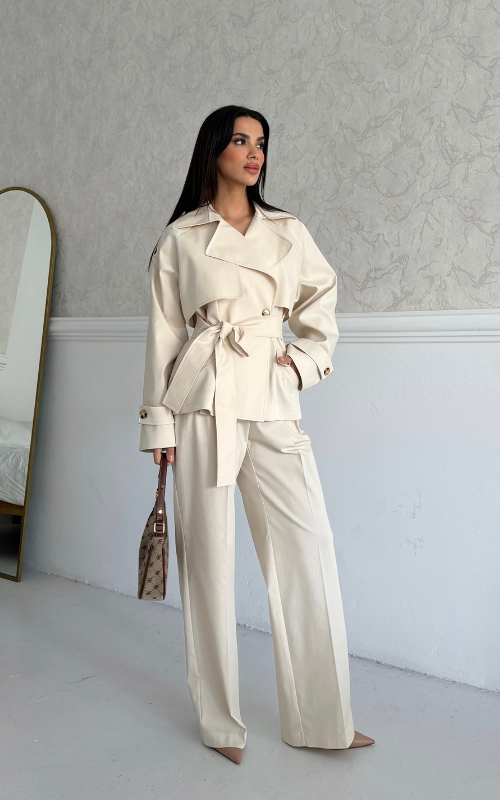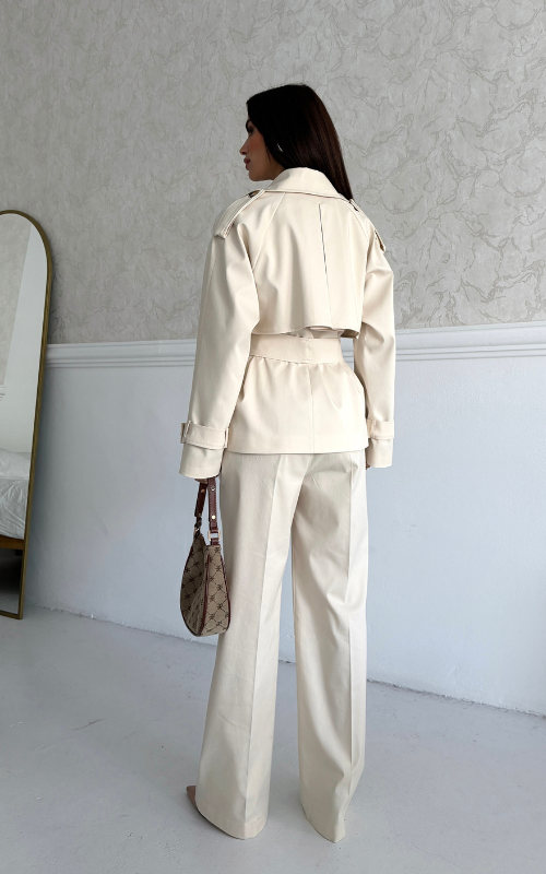 Set featuring a hip-length, trench coat style jacket and high waisted pant in matching fabric.