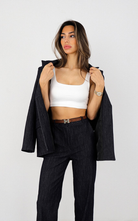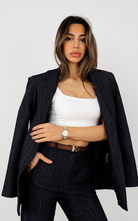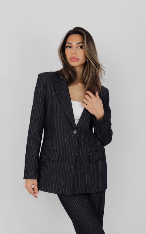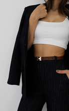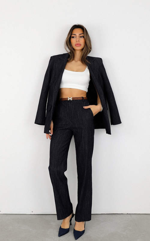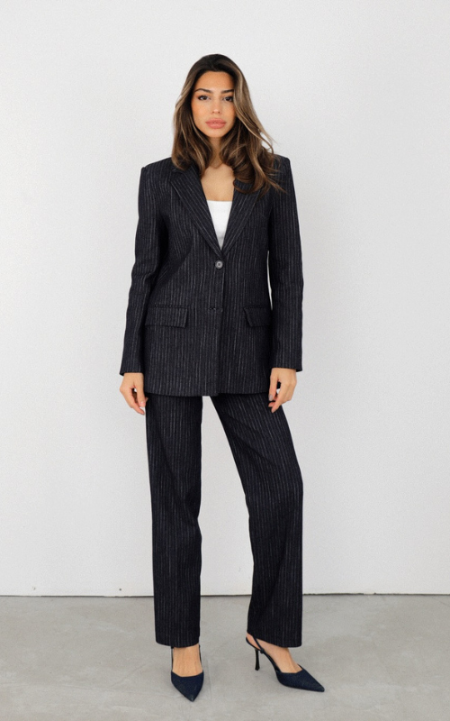 Set featuring a structured blazer in pin-striped fabric. Paired with a high waisted, tailored pant following a straight cut, made in matching fabric.