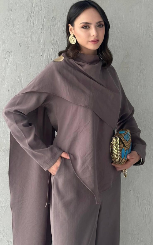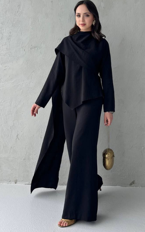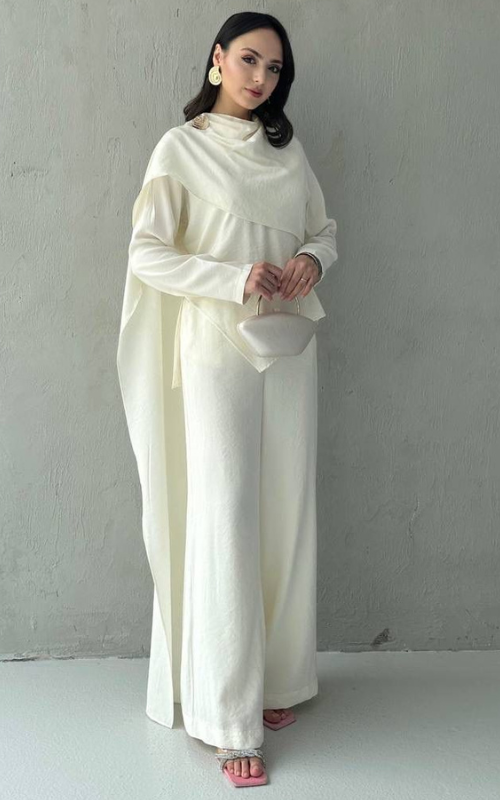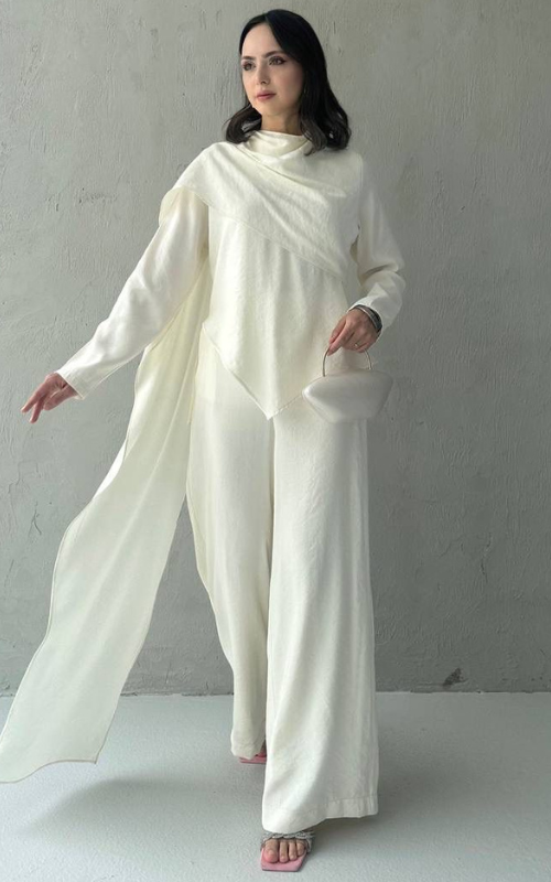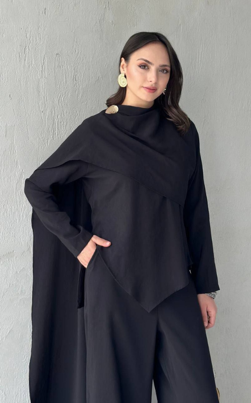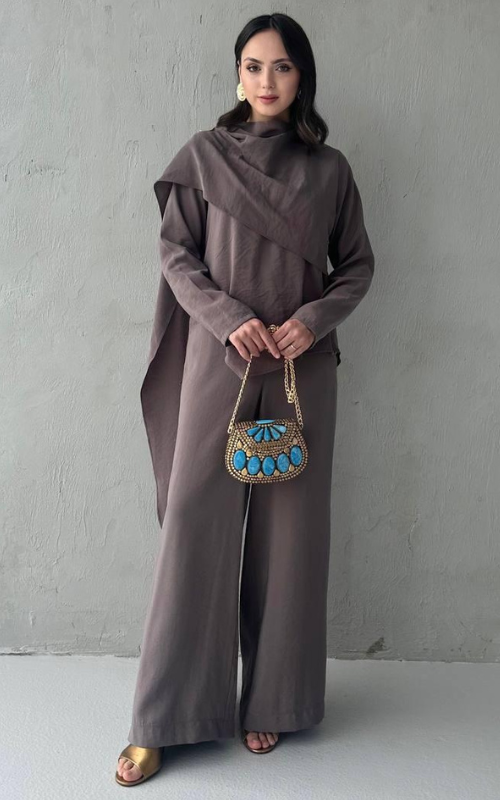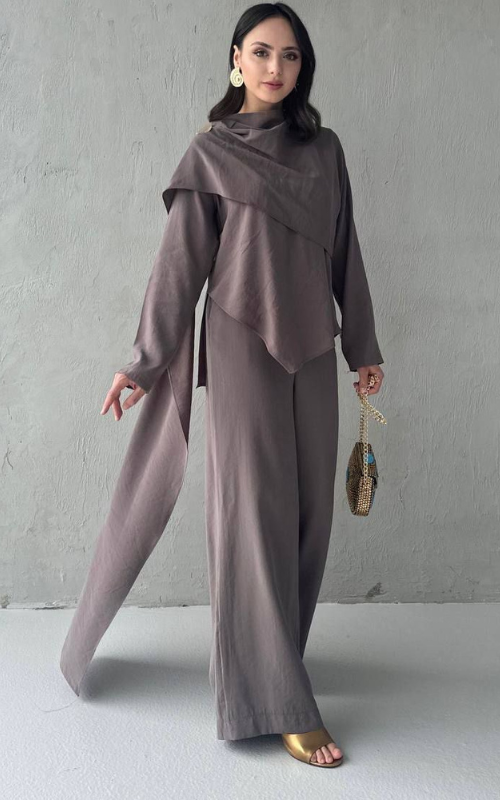 The Gianna Set is a modest ensemble featuring a long-sleeve top with an attached scarf and elegant metal shoulder detail, paired with classic straight-cut pants.