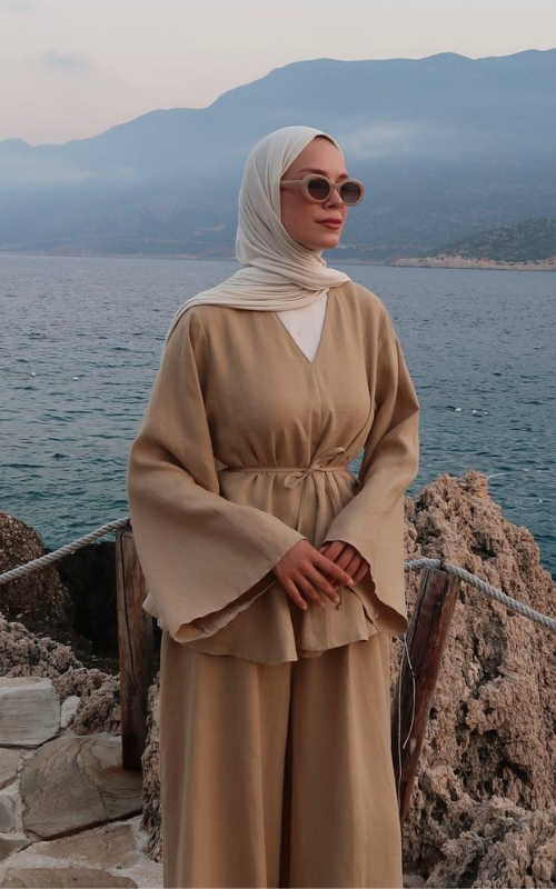 The Layal Top features a deep V-neckline, wide and flowing long sleeves and slightly flared hemline, giving it a soft A-line shape. The drawstring tie detail allows for an adjustable fit.
