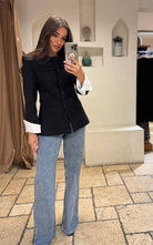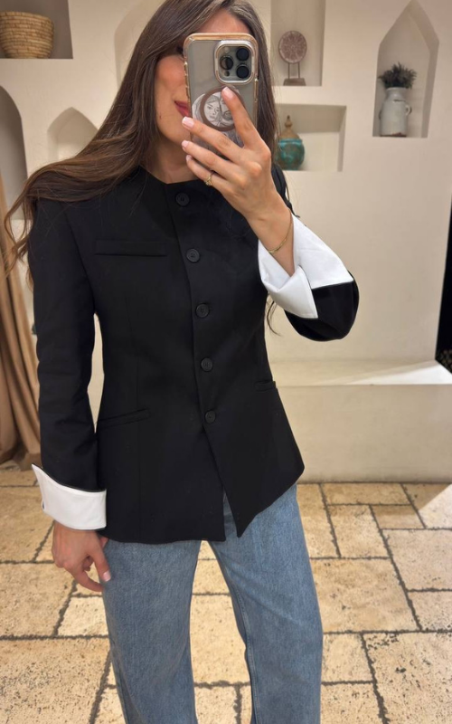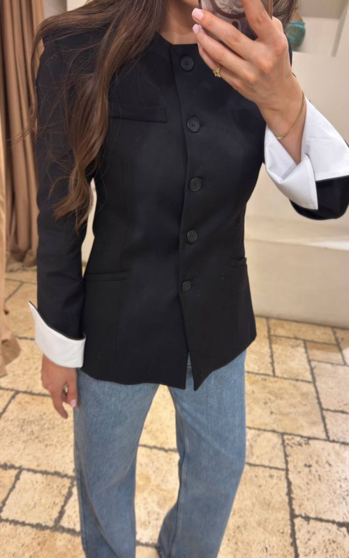 Slightly fitted structured blazer with buttons from neckline to waist, leaving a subtle open front, accented by contrasting white cuffs for a refined touch.