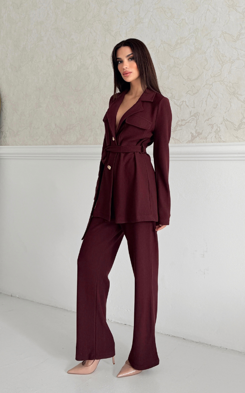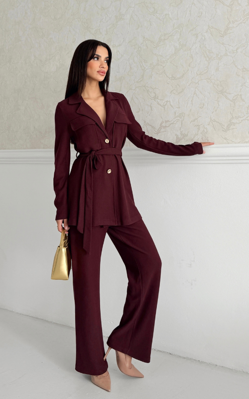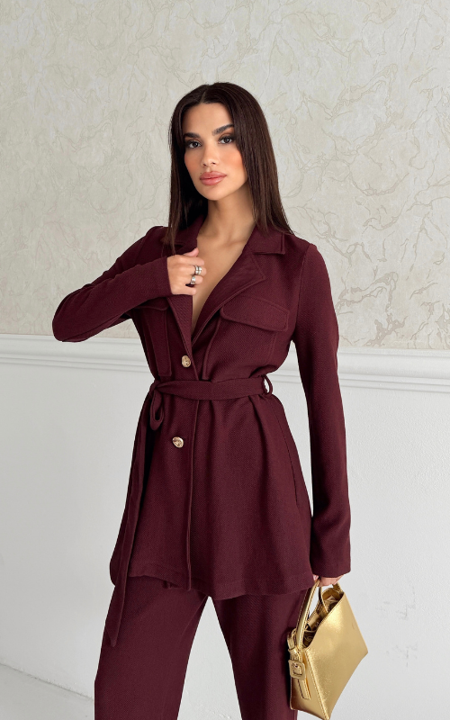 Hip length, soft trench-style coat with a relaxed drape, structured lapels and tie belt for an adjustable fit. Paired with a high waisted, wide-leg pant.