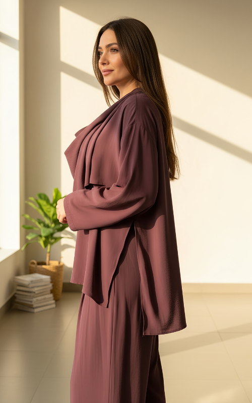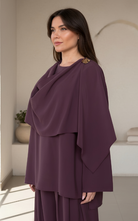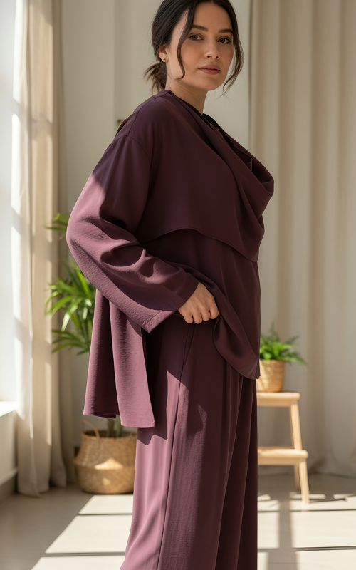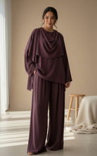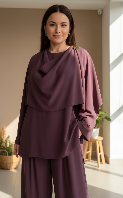 Elegant two-piece set featuring a draped cowl-neck top with statement shoulder button detail, paired with wide-leg trousers. Designed with a fluid silhouette for a refined yet effortless look.