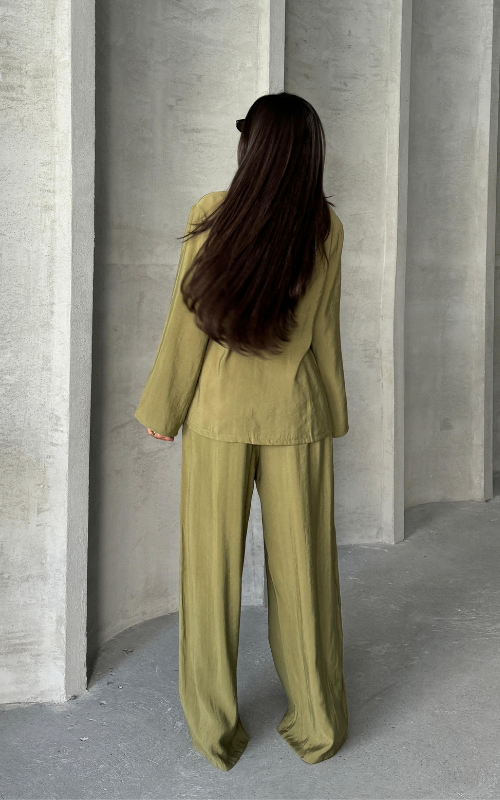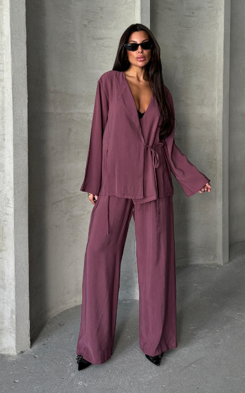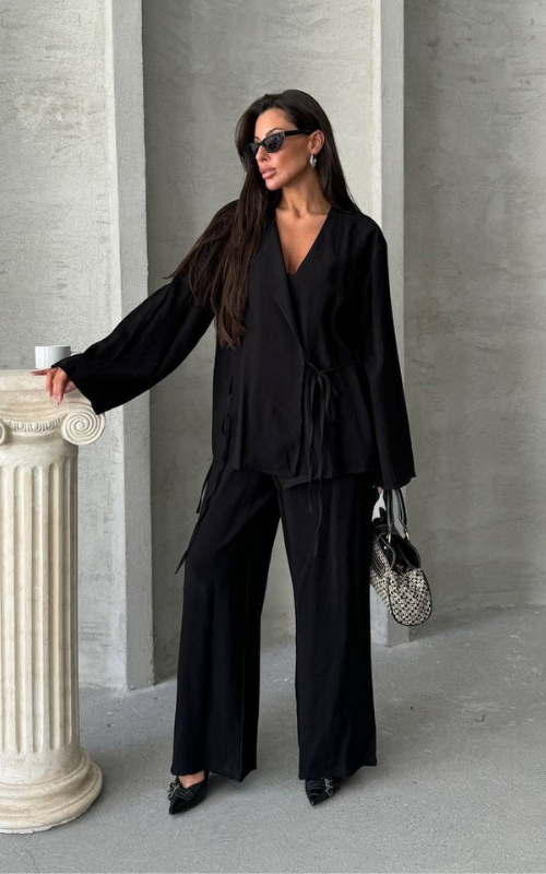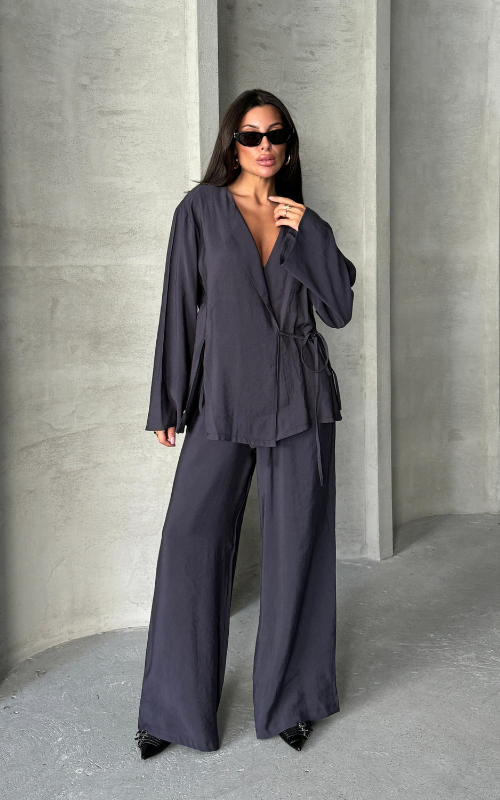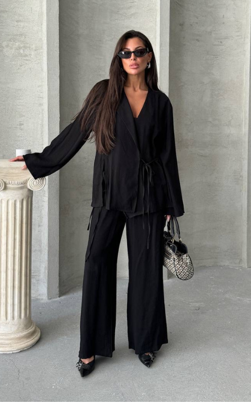 Upgrade your closet and style with our Sindy Set, featuring a kimono style, lace-up top with matching straight-cut bottoms, made of premium fabric.
