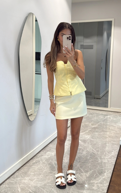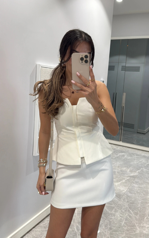 The Bossy Top is a structured strapless piece featuring a peplum silhouette and an invisible front zipper closure, crafted from high-quality fabric.