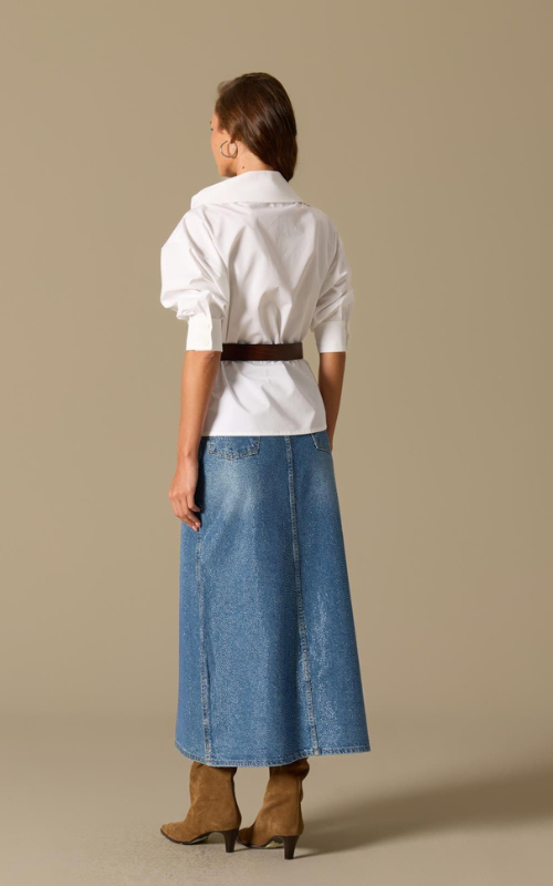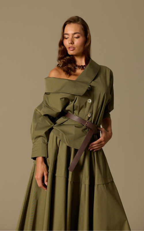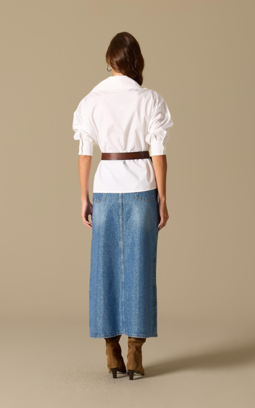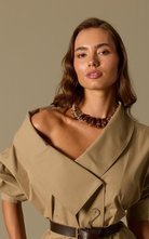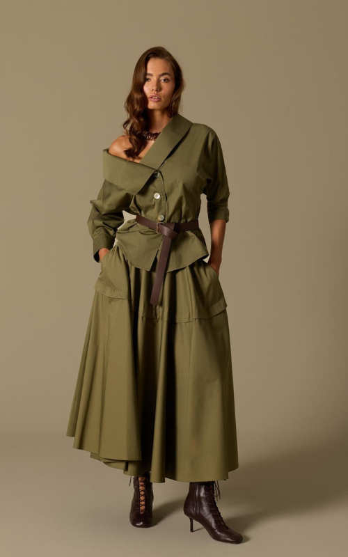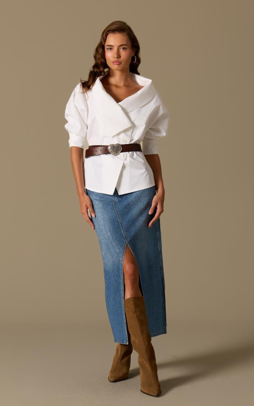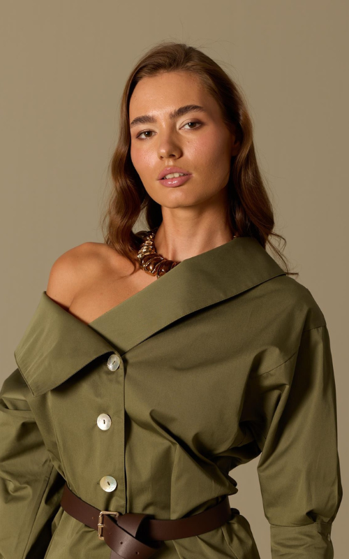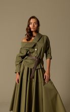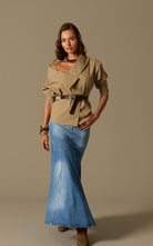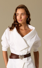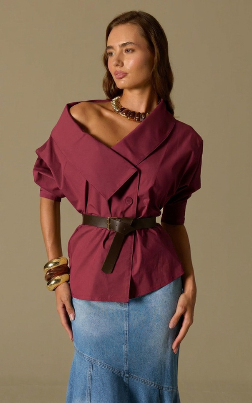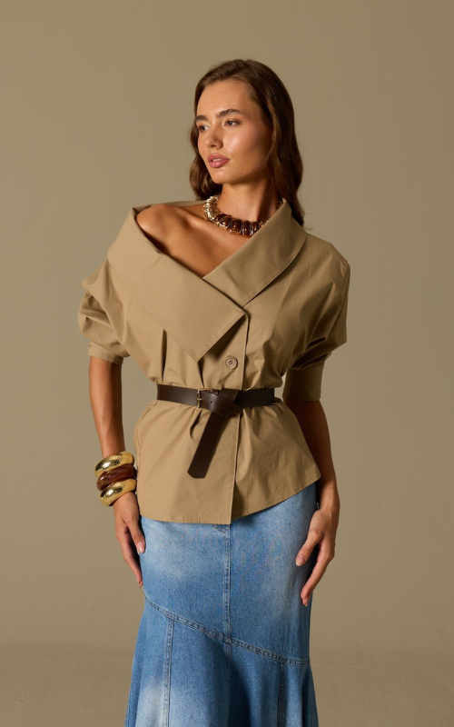 The Zayan Top features a wrap-style design with an asymmetrical neckline. The silhouette is balanced with puffed sleeves and fitted waist. It fastens at the front with a leather belt.