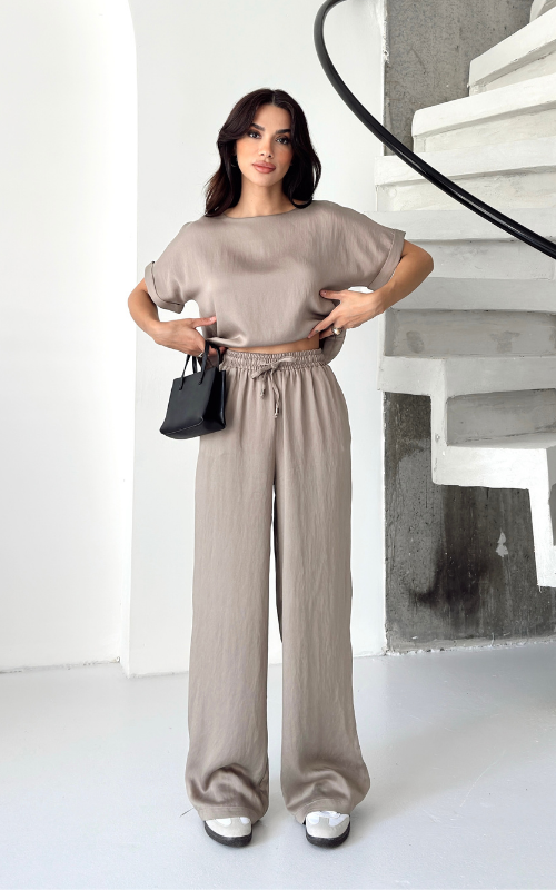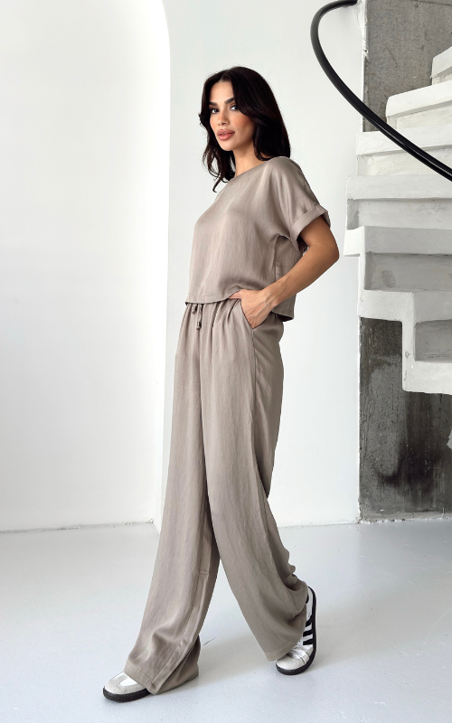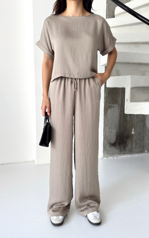 Slightly oversized, hip-length top with round neck and cuffed short sleeves. Paired with high waisted, wide leg pants crafted from the softest fabric.
