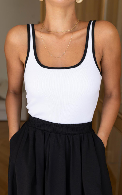 The Cairo Tank Top has a square neckline with black lines on the neck and shoulder sleeves. This versatile piece adds sophistication to any outfit.
