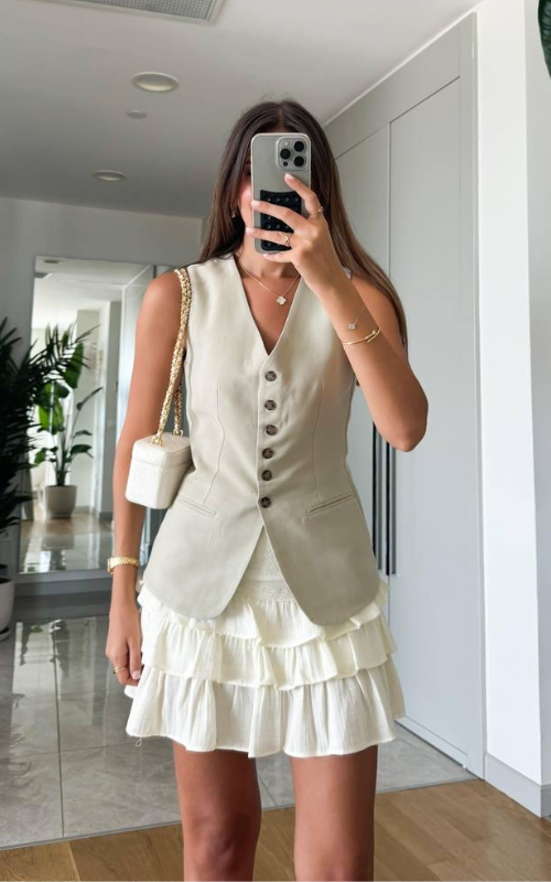 The Ella Slim Fit Vest is a chic button-up design with a flattering V neckline. Perfect for layering, this stylish vest adds a touch of sophistication to any outfit.