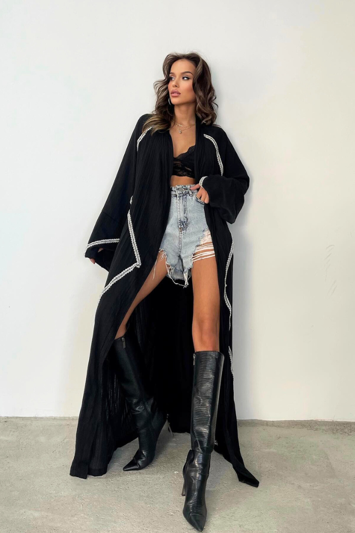 Long linen blend cardigan adorned with exquisite embroidery details, blending effortless style with timeless craftsmanship.