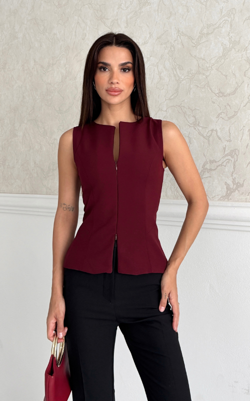 Structured sleeveless top with a clean, tailored fit and subtle panel detailing. Finished with a smooth center front zipper.