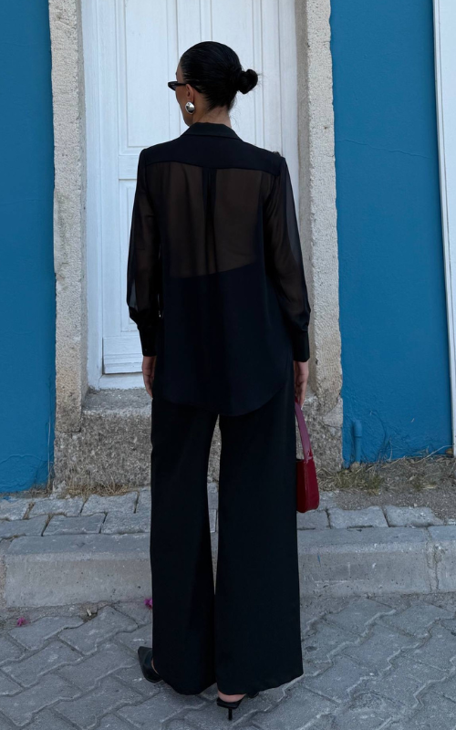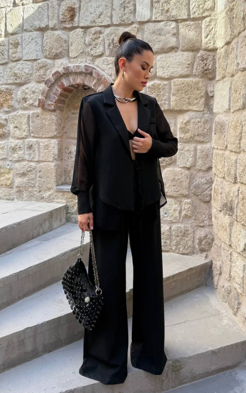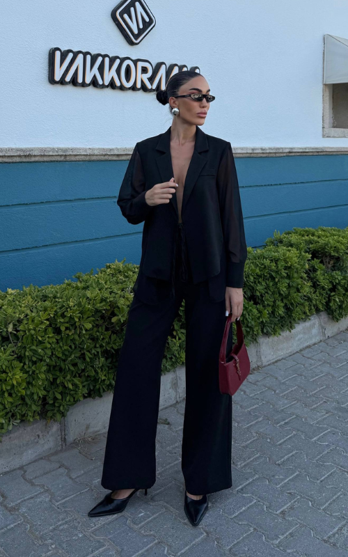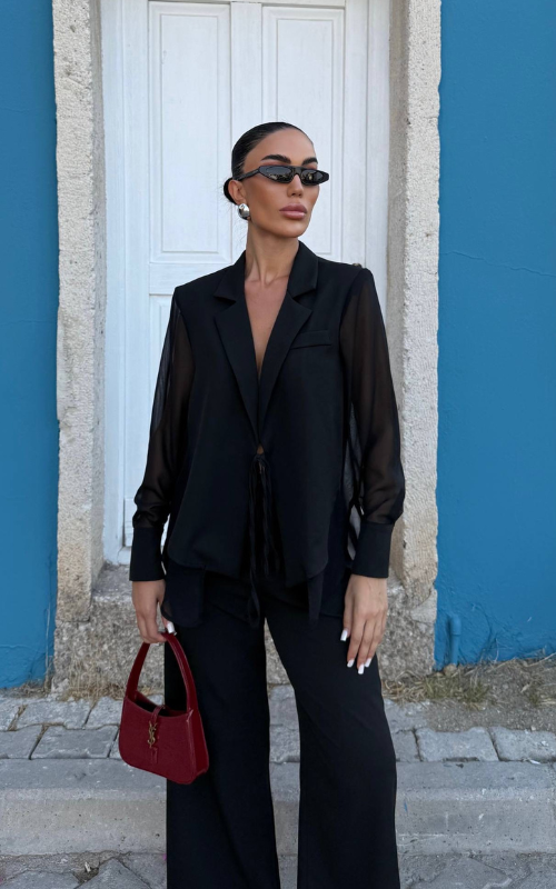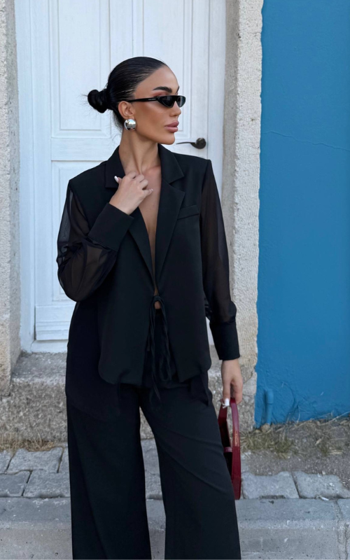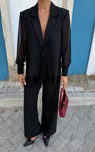 Chic black co-ord set features a sheer long-sleeve blazer with a deep neckline and wide leg trouser for a sleek minimalist silhouette. Back of the blazer in the same sheer fabric and there’s a tie belt detail for closure on the front.