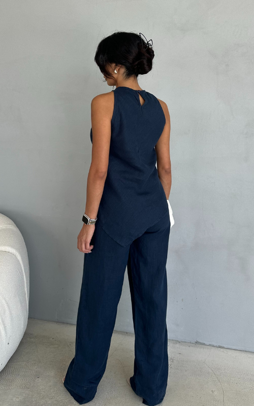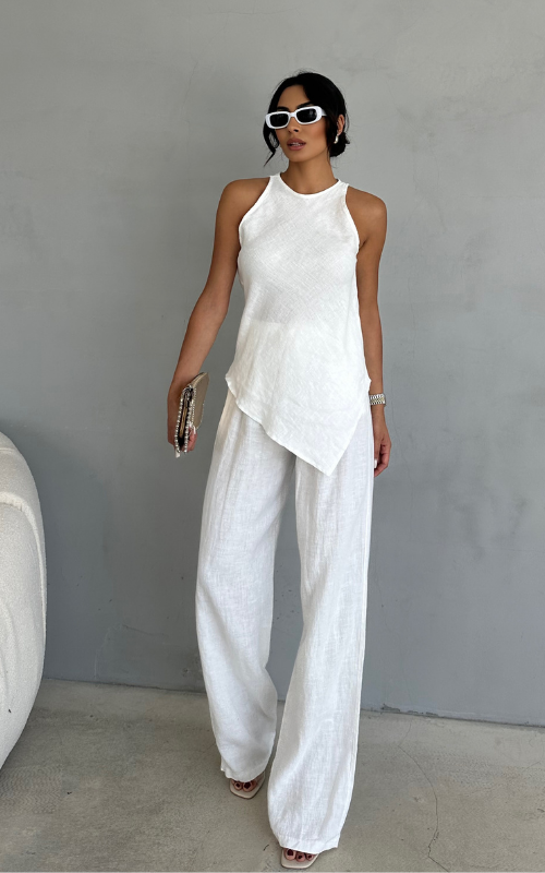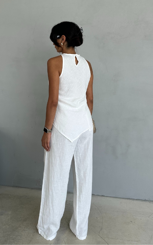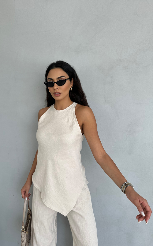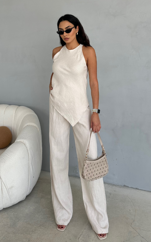 The Sienna linen pant set features a stylish top with a unique triangle hem and matching pants. Crafted from lightweight fabric, this chic ensemble is perfect for warm days, offering both comfort and a modern flair.