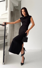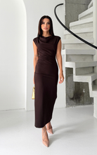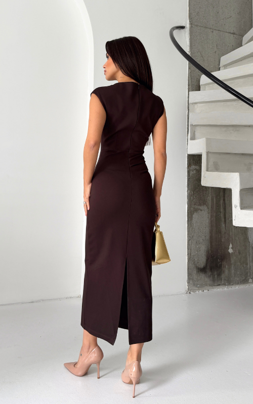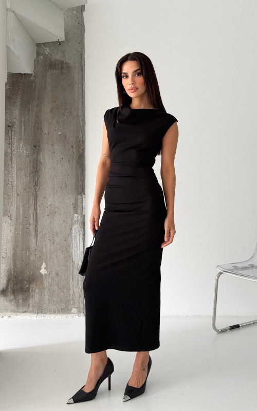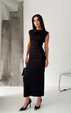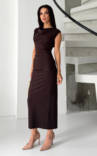 Body-hugging, midi dress featuring cap sleeves, round neckline and a cinched waist.