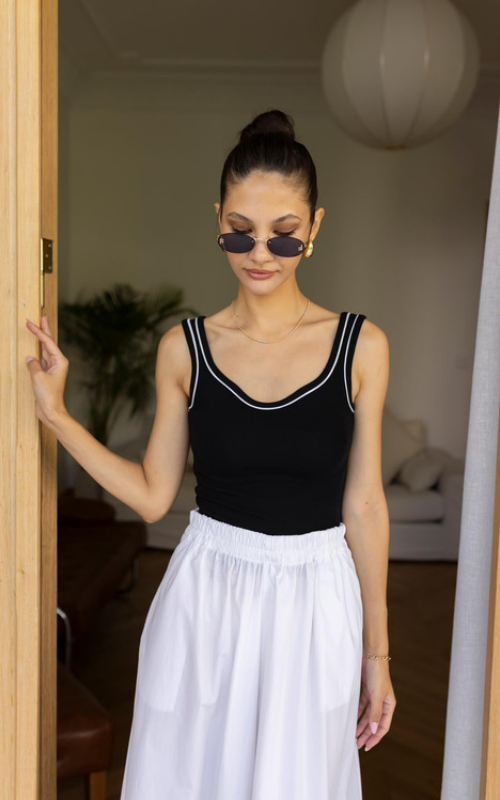 The Nova Sweetheart Tank is a sleek black top with a flattering sweetheart neckline and a chic white stripe along the edge, perfect for adding elegance to any outfit.