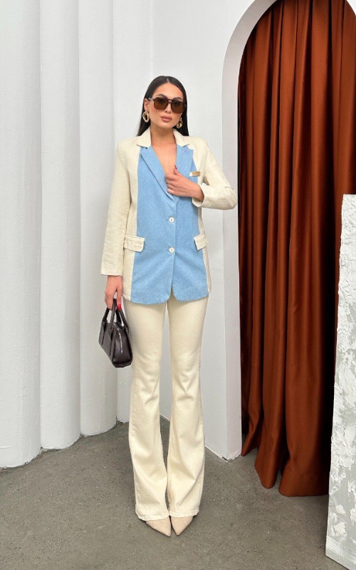 Chic two-tone blazer featuring a cream exterior with a soft blue inner panel. Tailored for a polished silhouette, this versatile piece adds a modern twist to classic layering”