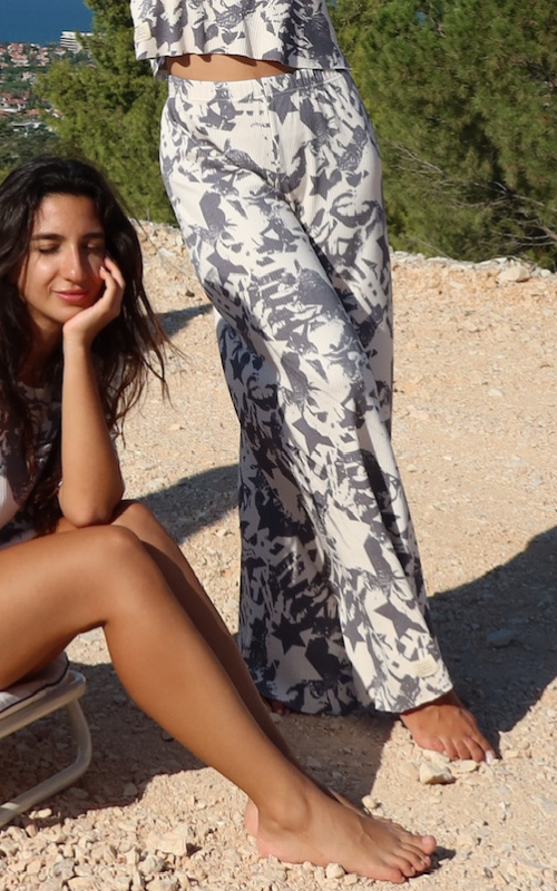 Patterned pant featuring a thin elasticated waistband and wide-leg silhouette. The fabric contains organic cotton and elastane.